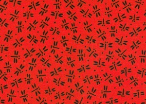 赤生地に黒のトンボがちりばめられている江戸小紋柄ですね。